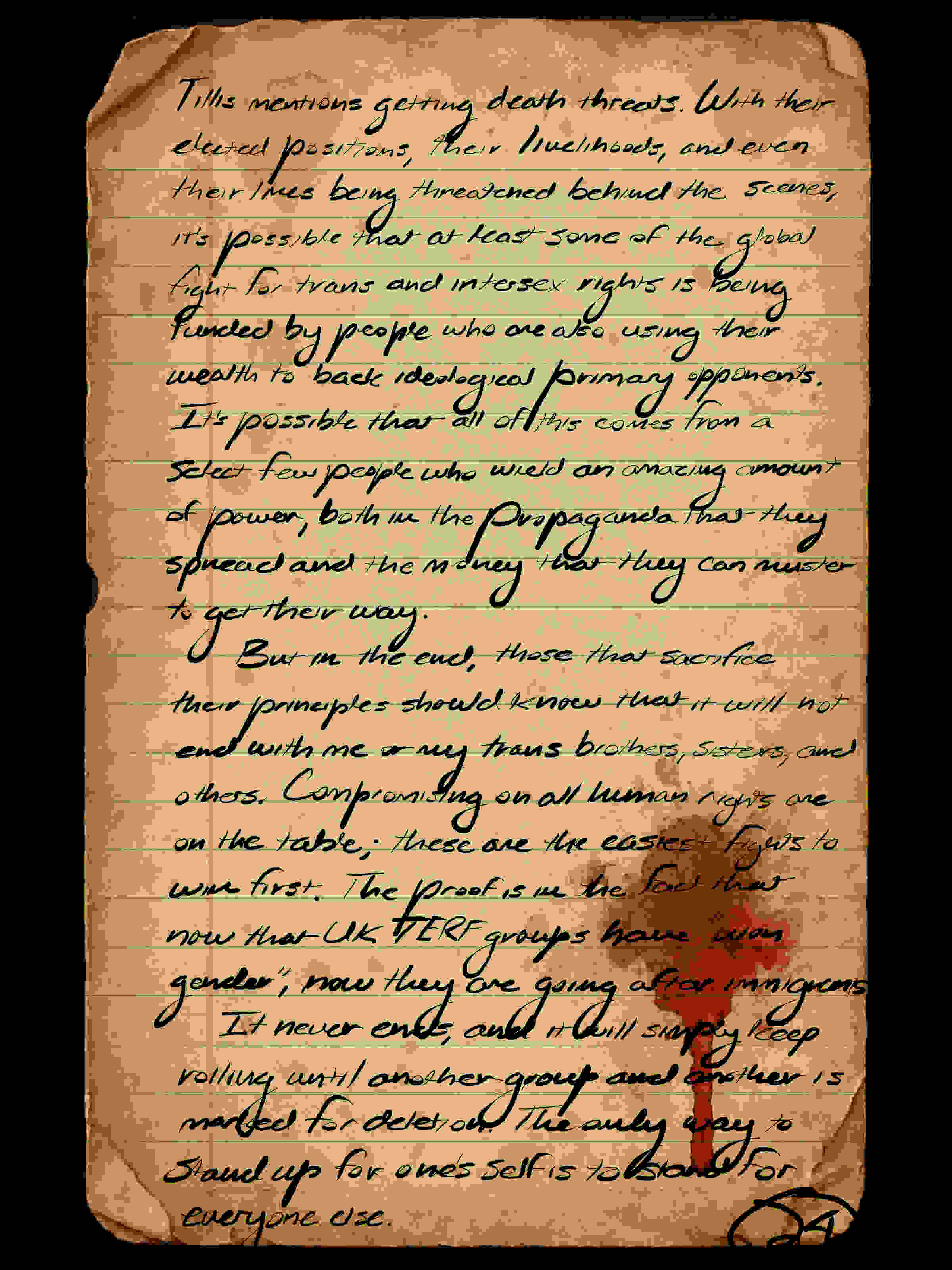 But in the end, those that sacrifice their principles should know that it will not end with me or my trans brothers, sisters, and others. Compromising on all human rights are on the table; these are the easiest fights to win first. The proof is in the fact that now that UK TERF groups have won gender, now they are going after immigrants.