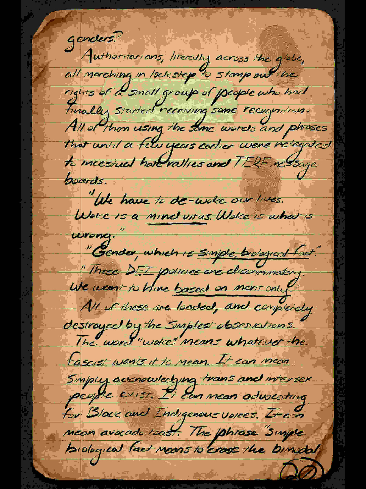 The word “woke” means whatever the fascist wants it to mean. It can mean simply acknowledging trans and intersex people exist. It can mean advocating for Black and Indigenous voices. It can mean avocado toast. *The phrase “simple biological fact” means to erase the bimodal—