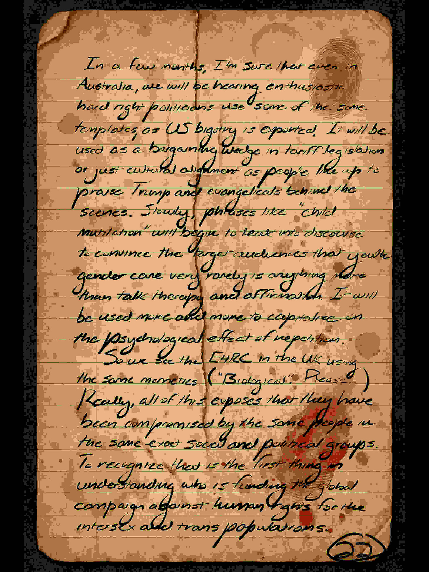 In a few months, I’m sure that even in Australia, we will be hearing enthusiastic hard right politicians use some of the same templates, as US bigotry is exported. It will be used as a bargaining wedge in tariff legislation or just cultural alignment as people line up to praise Trump and evangelicals behind the scenes. Slowly, phrases like “child mutilation” will begin to leak into discourse to convince the larger audiences that youth gender care very rarely is anything more than talk therapy and affirmation. It will be used more and more to capitalize on the psychological effect of repetition.