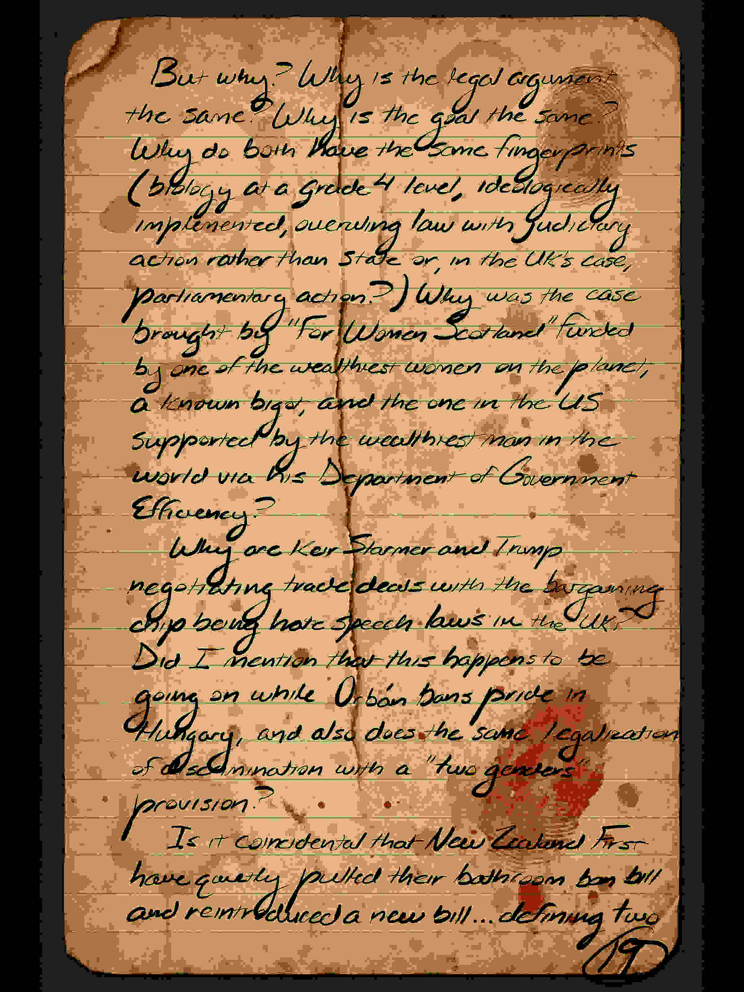 But why? Why is the legal argument the same? Why is the goal the same? Why do both have the same fingerprints (biology at a grade 4 level, ideologically implemented, overruling law with judiciary action rather than state or, in the UK’s case, parliamentary action?) Why was the case brought by “For Women Scotland” funded by one of the wealthiest women on the planet, a known bigot, and the one in the US supported by the wealthiest man in the world via his Department of Government Efficiency?