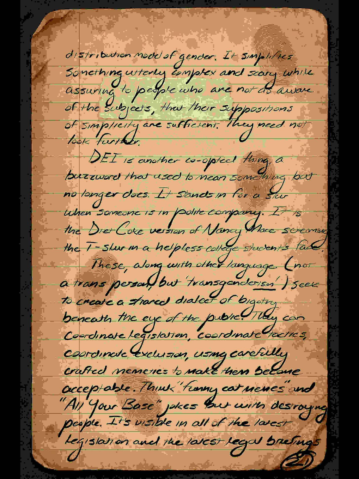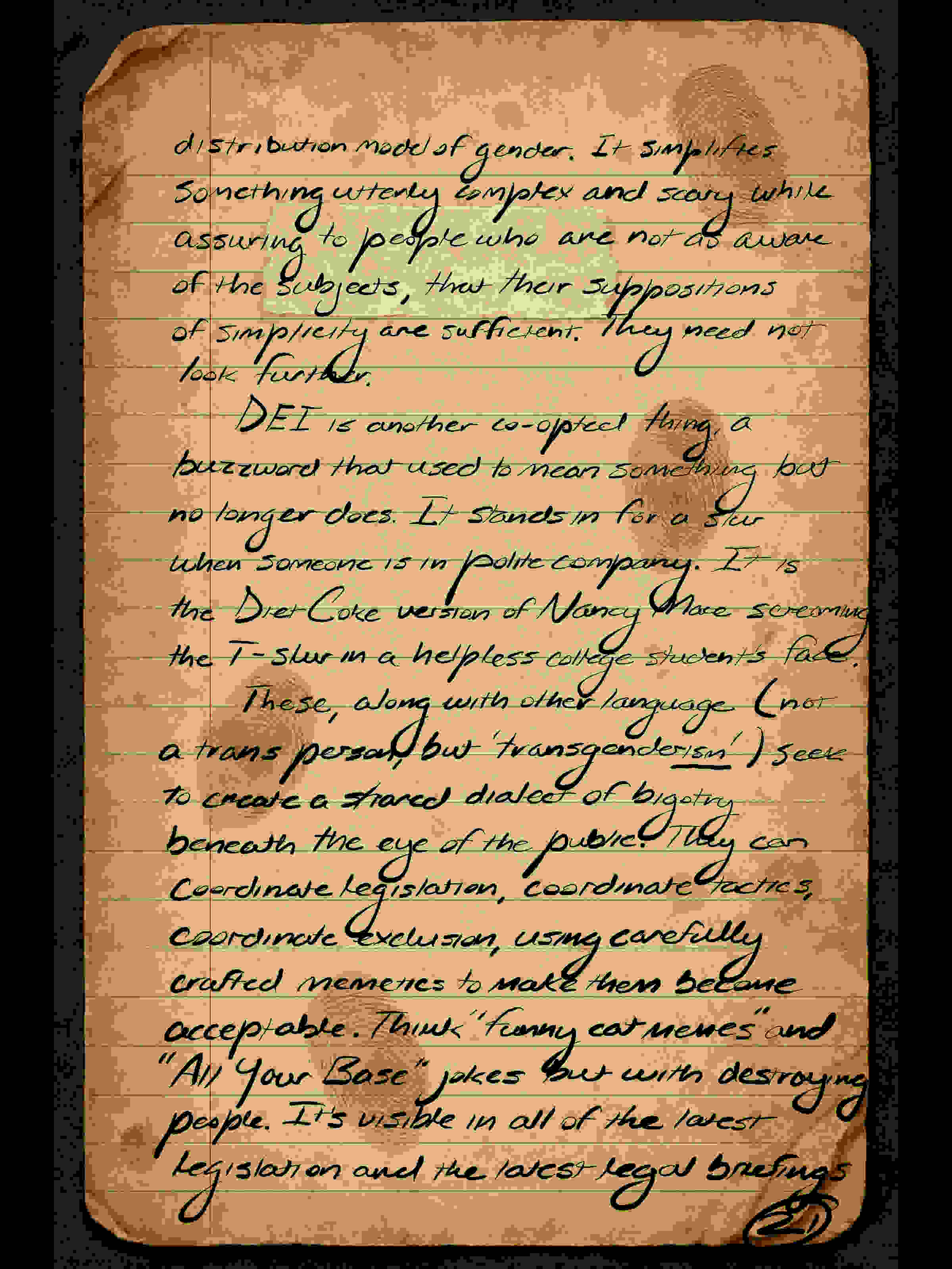 These, along with other language (not a trans person, but “transgenderism”), seek to create a shared dialect of bigotry beneath the eye of the public. They can coordinate legislation, coordinate tactics, coordinate exclusion, using carefully crafted memetics to make them become acceptable. Think “funny cat memes” and “All Your Base” jokes but with destroying people. It’s visible in all of the latest legislation and the latest legal briefings.