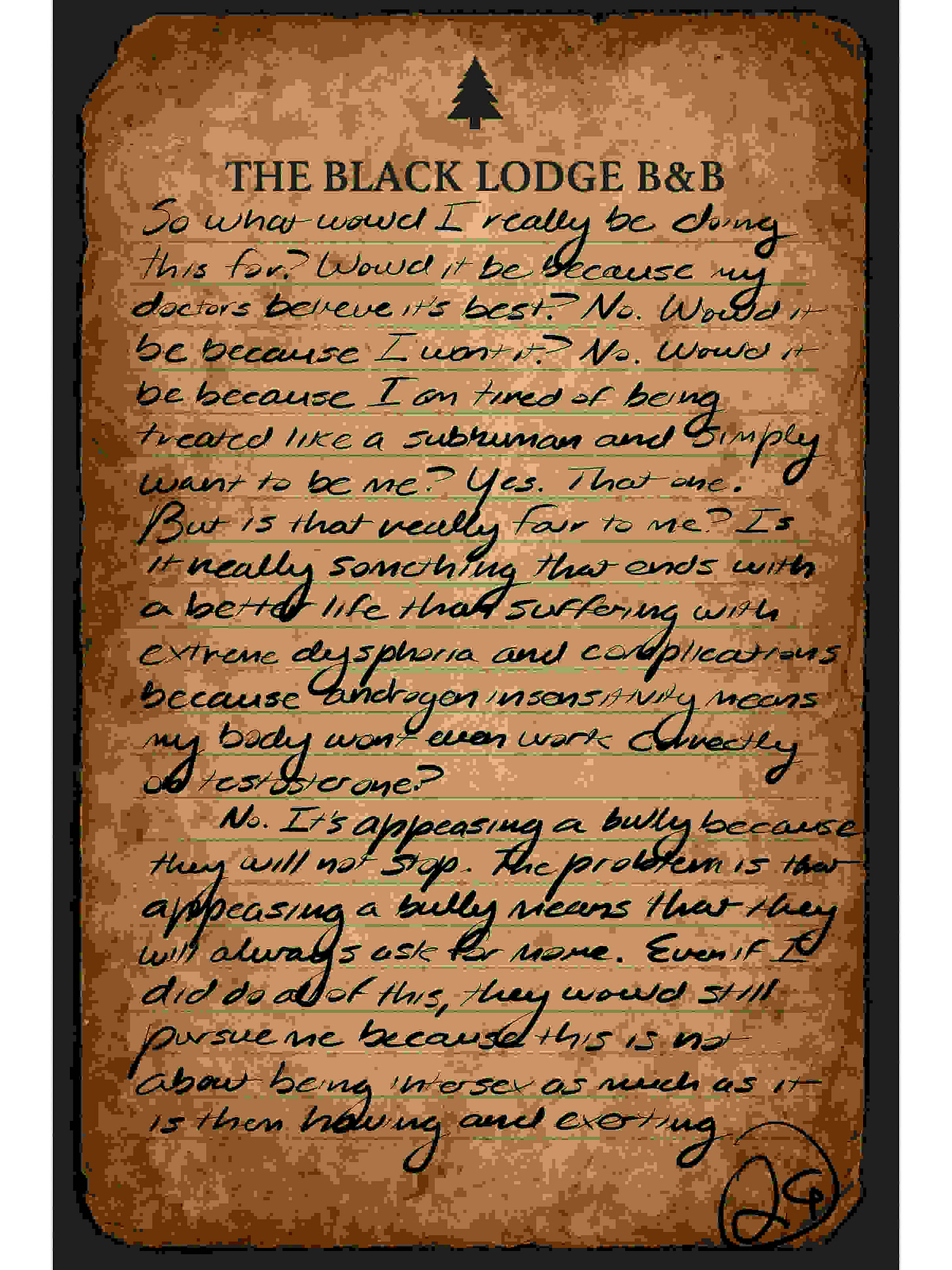 What if I detransitioned? What if I left myself behind—reverted my documentation to an old, incorrect version to appease the bigoted and the ignorant? What if I undid decades of me to become someone I never recognized—someone I don’t even remember? Who would that person be? That existence feels like a nebulous blob of personhood, always creeping around the edges.