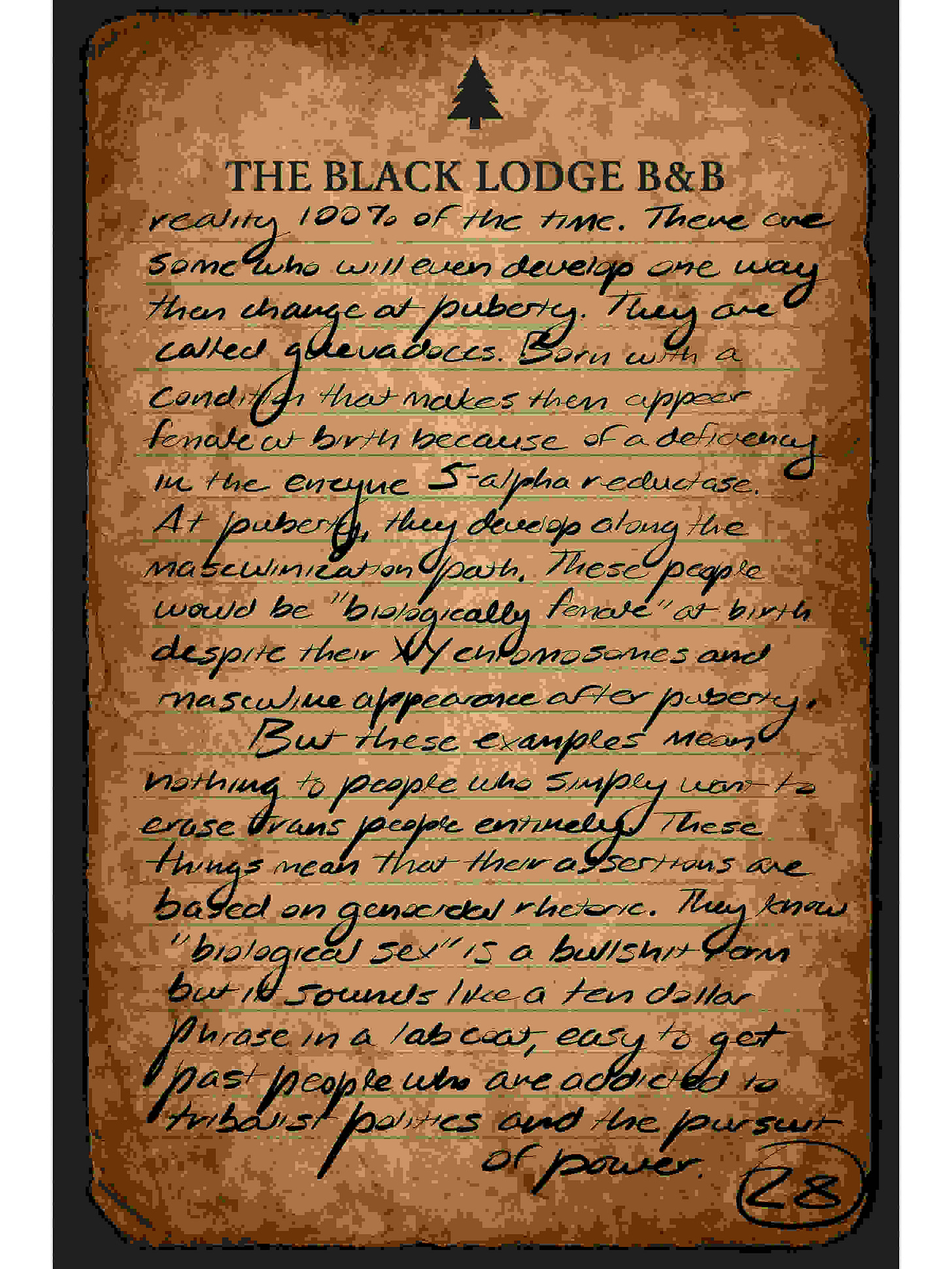But these examples mean nothing to people who simply want to erase trans people entirely. These things mean that their assertions are based on gendered rhetoric. They know “biological sex” is a bullshit term but it sounds like a ten dollar phrase in a lab coat, easy to get past people who are addicted to tribalist politics and the pursuit of power.