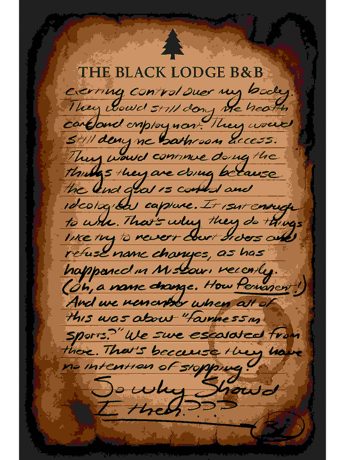 In the end, nothing would make them happy—not even if I clasped hands with that stranger, that phantom. They want something more. We know this because it’s no longer about “fairness in sports”—though that was once their rallying cry, alongside “just asking questions.” My, my, my… how far we’ve come.