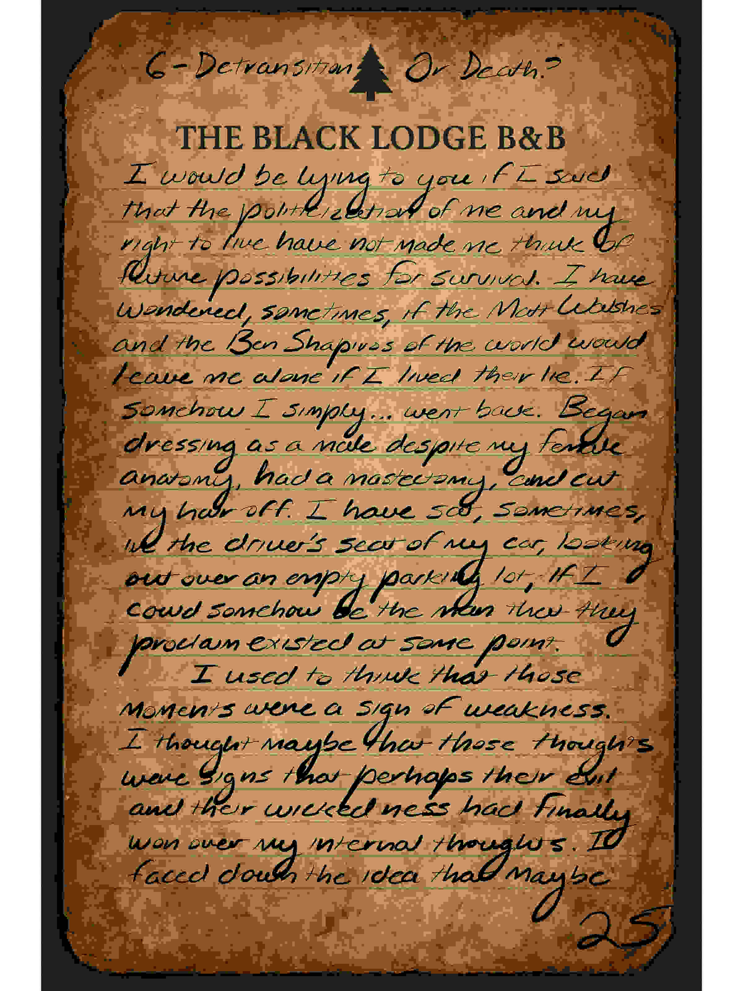 I would be lying to you if I said that the politicization of me and my right to live have not made me think of future possibilities for survival. I have wondered, sometimes, if the Matt Walshes and the Ben Shapiros of the world would leave me alone if I lived their lie. If somehow I simply… went back. Began dressing as a male, despite my female anatomy. Had a mastectomy. Cut my hair off.