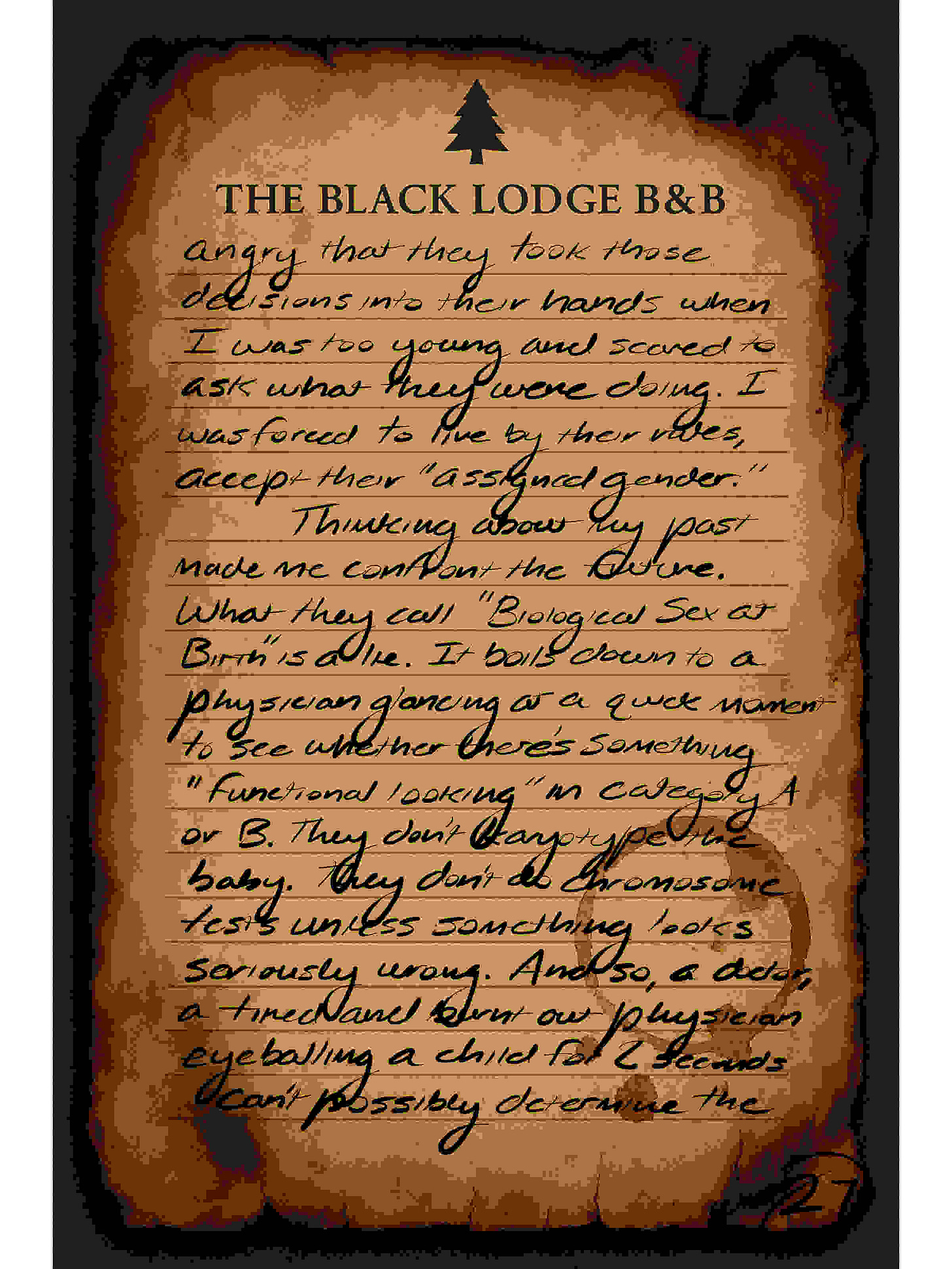 angry that they took those decisions into their hands when I was too young and scared to ask what they were doing. I was forced to live by their rules, accept their “assigned gender.”